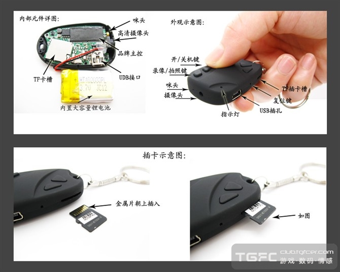 朋友送的几个007系列车钥匙扣微型摄像机。可当移动U盘支持8GTF内存卡(跟手机内存卡通用)。功能:拍照录象录音,体积小巧录象清晰。自己留了一个把玩,剩下的几个车钥匙扣录象机转让给爱好此产品的朋友分享。特价98元。更多产品图片和详细资料介绍,请去QQ:380725176空间日志里面查看。联系QQ3807251763支持淘宝支付宝交易安全可靠。 主要参数: 视频格式:AVI; 图像格式:720*480 拍照格式:1280 x 960; 电池容量 :280毫安3.7V; 重量:20克 内存容量:无内存,插卡最大支持8GB TF卡