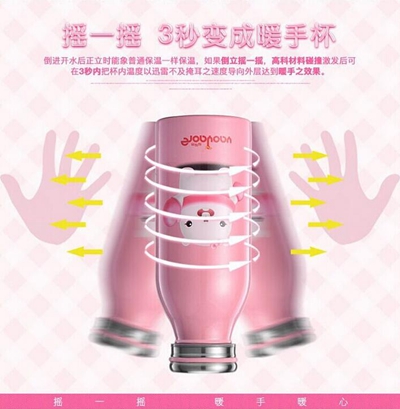 摇一摇3秒变成暖手杯,倒进开水后正立时像普通保温一样保温,如果倒立摇一摇,高科材料碰撞激发后可在3秒内把杯内温度以迅雷不及掩耳之速度导向外层达到暖手之效果!