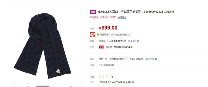 意大利Moncler是一家总部位于法国格勒诺布尔专门从事生产户外运动装备的著名品牌,在欧美是超牛逼的品牌!蒙口Moncler普普通通一款35%羊毛的围巾京东售价高达800+RMB(留意图一),这样的价格已经把我大宝拒之门外了!当然,想佩戴一条蒙口的围巾不一定要在京东或者专柜购买,那里真的很贵!伤不起啊!同样35%羊毛(留意最后一张图片有成分介绍)同样的质量,大宝这里只需要78RMB包邮,货源来自于原工厂尾单货(不走专柜),所以数量极少!在TB普通品牌的羊毛围巾都要100+以上、而且销量非常好!所以这款围巾大宝纯碎是给兄弟们姐妹们送福利拉人气的礼品!有需要的来秒吧!不秒也可以添加大宝的WEI信,里面有更多的外贸原单货!总有一款适合你!