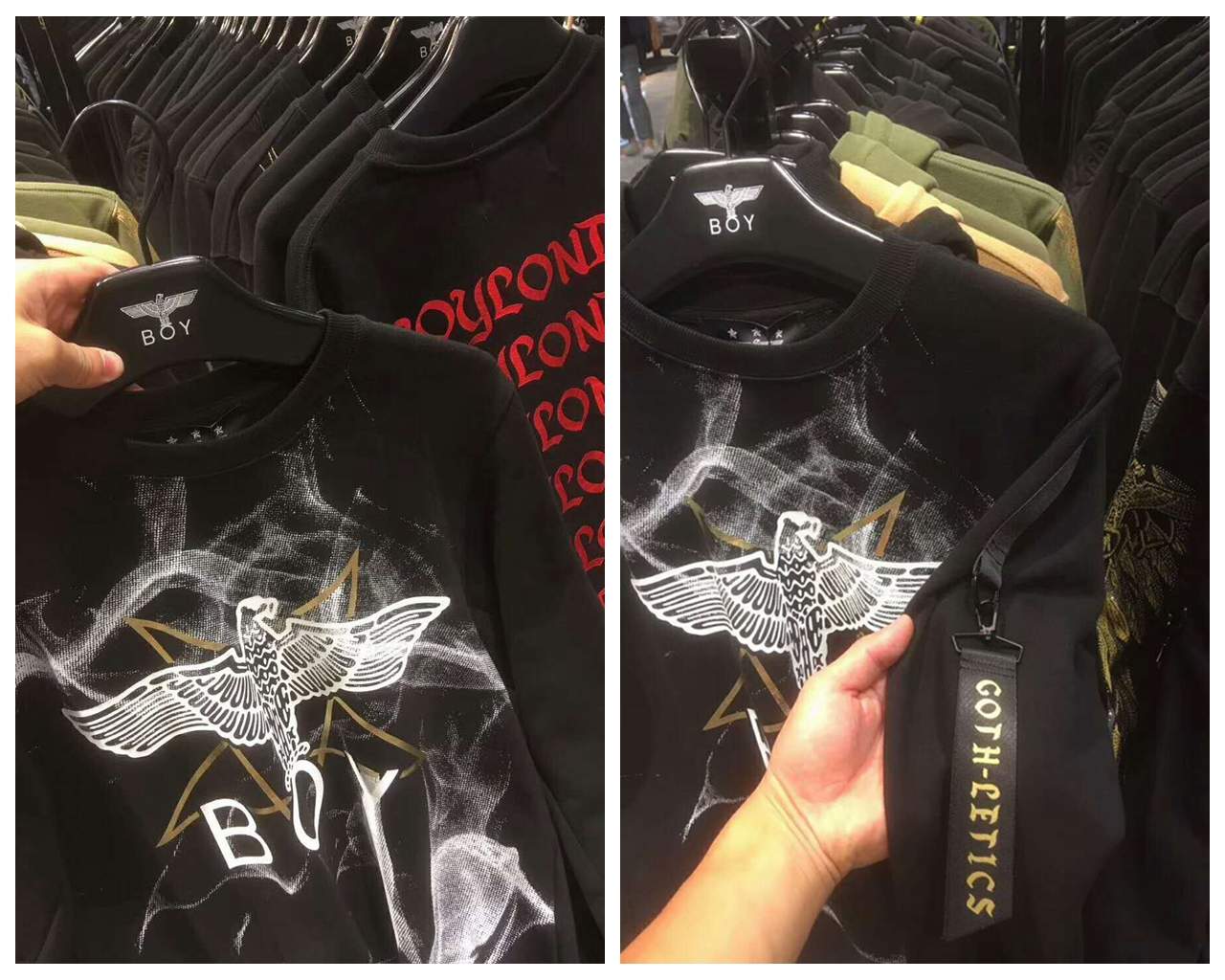 品名:boy烟雾卫衣 158包邮 编号736105100。颜色:金色 和红色。2017boy专柜新款,10月1日官网出官方图,各大专卖店门店模特上身作为主推款,boy烟雾系列毛圈卫衣,山东胶州工厂出品,原箱原版包装来货。独家款,男女同款,袖口是亮点,螺纹很长,穿起来是炸裂的感觉,让你是不一样的烟火。肩袖上的拉条飘带都是胶州订单原厂配件,后期可能就没有原厂配件了。男女同款,s到2xl,最大穿到190斤左右。必须暴躁,必须主推。 独家独家,光是烟雾系列的印花可以难倒很多做仿版的老板。 独一无二。